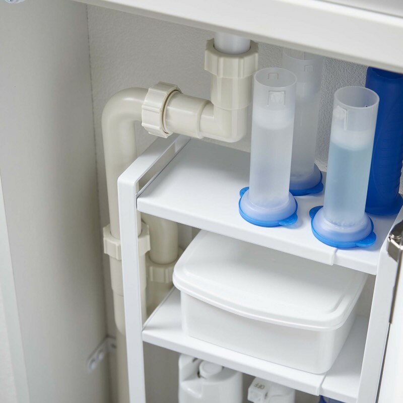 キャビネット内の配管下のスペースに置くだけの簡単設置!収納場所に困る小物や詰め替え袋などを一括収納。