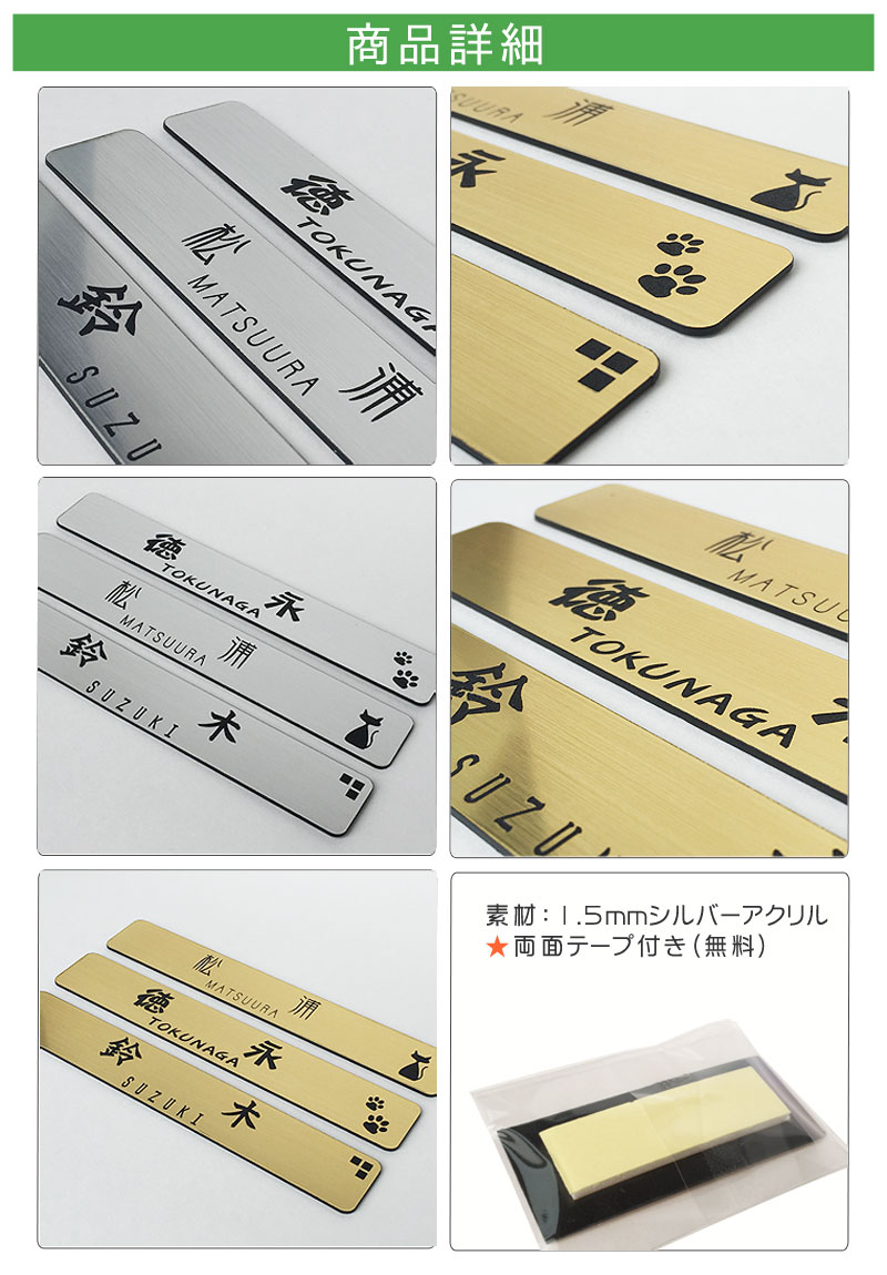 - 商品詳細 - サイズ(縦×横):2.5cm x 15.5cm カラー:GOLD/SILVER 厚さ:1.5mm 素材:アクリル ※表札をご購入される皆様に、両面テープをプレゼントいたします!※2018年10月下旬より、付属の両面テープは薄型に変更となりました。
