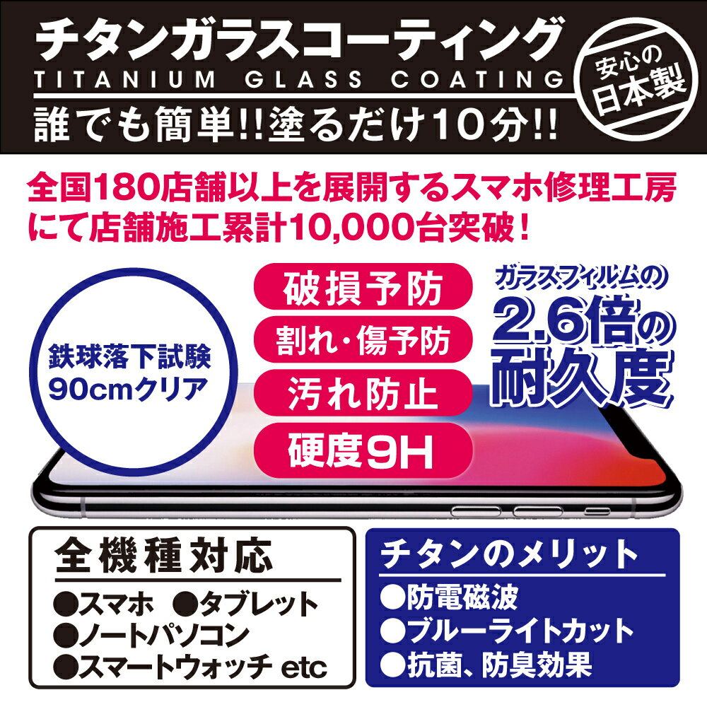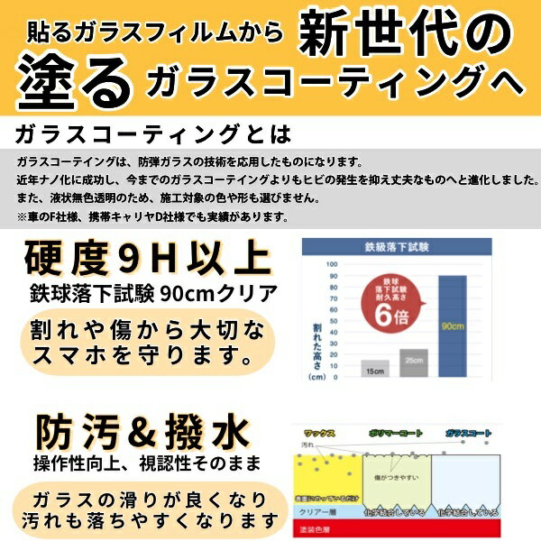 この商品は 【完全プロ仕様!!】 iPhone スマホ Android 任天堂switch appleウォッチ iPad コーティング剤 ガラスコーティング 画面保護 撥水 防傷 液晶 除菌 送料無料 ポイント iPhone スマホ Android switch スイッチ タブレット ノートPC コーティング フィルム 実際の店舗でも使用されているプロ仕様のガラスコーティングです ガラスコーティングとは、特殊な液体ガラスをスマートフォンに施す事で約20日ほどで硬度9Hの硬さに達します。