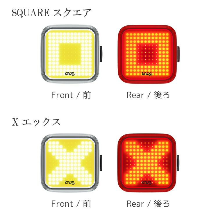 〜第三世代のBLINDERのここがスゴイ!〜 ●デザインの力で安全性とかっこよさを両立する ●BLINDER MOBよりも明るさは2倍 ●最大光量のランタイムも1.5倍に延長 品名 【 Knog 】New Blinder Front / Rear ( ブラインダー フロント / リア ) ライト 品番 BLINDER-TWIN-PACK サイズ(cm) LED面サイズ: 4cm×4cm モデル SQUARE ( スクウェア ) X ( エックス ) 最大光量 フロント 200ルーメン / リア 100ルーメン 搭載LEDランプ COB(Chip on Board)LED搭載 連続点灯時間 Steadyモード 2.5時間 Eco Flashモード 55時間 重量 34g 充電時間 4時間〜5時間 点灯パターン 8種類のモードパターンと明るさ設定 ※SKULLのみ9種類のモード 仕様 100%防水 ライト本体のUSBプラグからケーブル不要で直接充電可能 KNOGらしいユニークなパターンで、自転車の存在を周りに知らせます ワンタッチで取付け可能なハンドル径22〜40mmに対応のシリコンストラップアタッチメント バッテリー残量減少時に電源を切った後2秒間点灯するバッテリーインジケーター搭載 あらゆるバイクにフィットするスリムなBLINDERの基本デザインはそのまま継承 ユニークなデザインが特徴の第三世代BLINDERが登場。