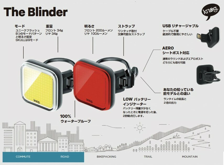 ライト出力:200ルーメン 点灯時間:MAX 2.5h / ECO FLASH 55h(フロント/リヤ共通) 重量:34g 使用バッテリー:リチャージブル リチウムイオンポリマーバッテリー ライトパターン:8種(SKULLのみ9種) その他:100%完全防水- KNOG "BLINDER" - SAFETY IN STYLE スタイルを備えた安全性 デザインの力で退屈で使いたくない製品を、かっこよく使ってみたい製品へ変え、結果的に安全性をUPする。
