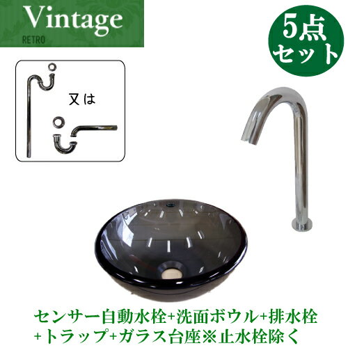 洗面ボウル 強化ガラス製 レトロ 手洗い器 おしゃれ 自動水栓 センサー セット 5点 ヴィンテージ 洗面台 シンク 置き型 非接触 タッチレス 交換 リフォーム 洗面所 トイレ 直径280 B-280mm-0305006Hset