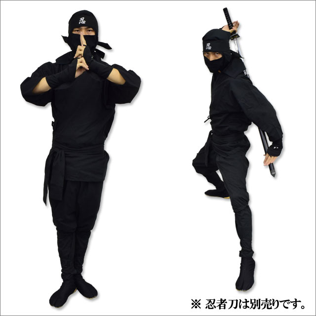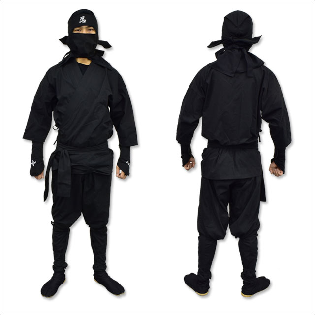 おかげさまで、楽天ランキング(コスチューム部門)で、 第2位になりました!有難うございます!!■ 商品名 本格大人忍者スーツセット ■ サイズ Mサイズ Lサイズ LLサイズ 3Lサイズ 身長:155〜165cm 身丈:77cm ズボン丈:110cm 身長:165〜175cm 身丈:80cm ズボン丈:114cm 身長:175〜185cm 身丈:83cm ズボン丈:118cm 身長:185〜195cm 身丈:86cm ズボン丈:122cm ■ 素 材 ポリエステル65%・綿35% ◆しのびやオリジナルだからできたこの価格!◆ 忍者服上下・忍者頭巾・忍者はちまき・忍者手甲・帯のお得なセットです! これで完璧、忍者になれる! ■モデルは170cmでMサイズを着用しています。