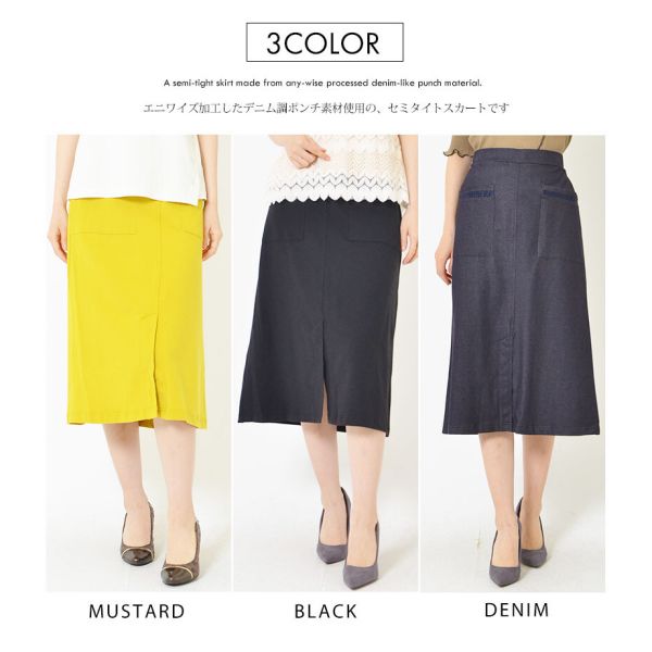 【2022新作】エニワイズ ポケットアクセントスカートエニワイズ加工したデニム調ポンチ素材使用の、セミタイトスカートです全体は、スッキリ見えるセミタイトシルエット。