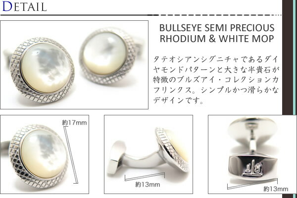 BUSINESS BULLSEYE SEMI PRECIOUS RHODIUM & WHITE MOP タテオシアンシグニチャであるダイヤモンドパターンと大きな半貴石が特徴のブルズアイ・コレクションカフリンクス。