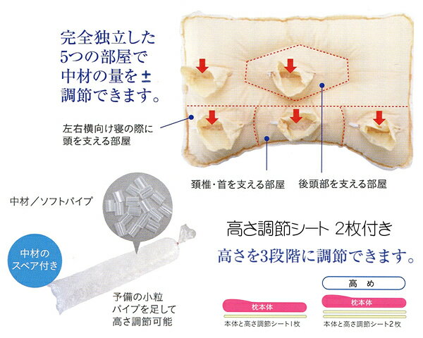 また、2枚の高さ調節シートで、枕全体の高さを3段階に調節できます。