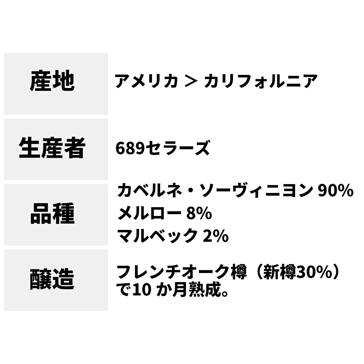 【年数表記にorがある商品は年数指定はできません】産地アメリカ > カリフォルニア生産者689セラーズ品種カベルネ・ソーヴィニヨン 90% 、 メルロー 8% 、 マルベック 2%英字Submission Cabernet Sauvignon醸造フレンチオーク樽(新樽30%)で10 か月熟成。