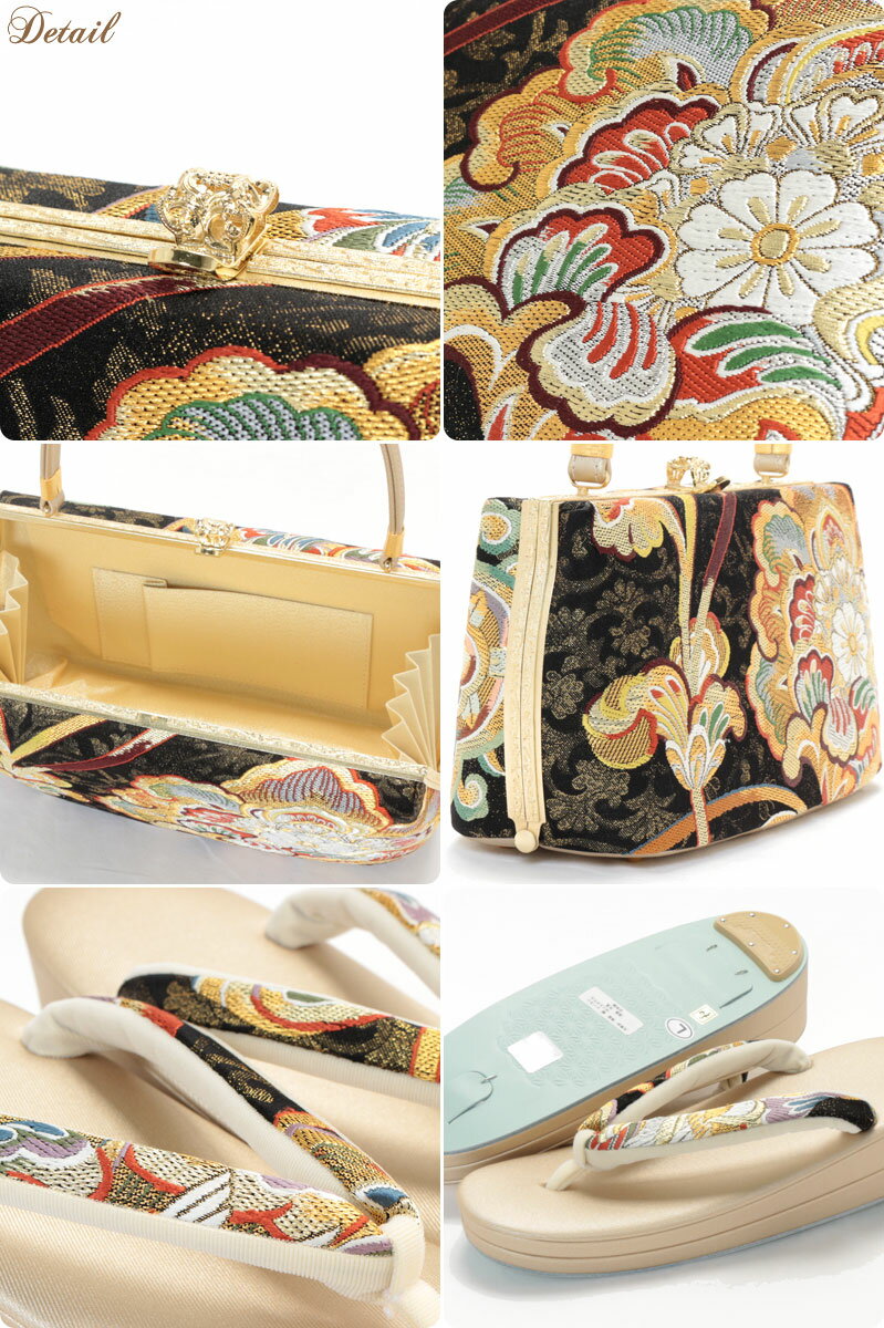 京都西陣の高級袋帯地を使用したバッグと花緒には、金彩唐草が入るブラックをベースに上質な金糸・銀糸がふんだんに使用され、大きな牡丹唐草が織り込まれた高級感溢れるデザインです。